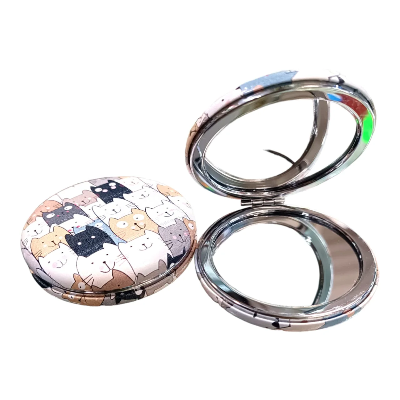 Hermoso y práctico espejo de bolsillo doble de forma circular, uno de los espejos es de aumento, el borde del espejo esta hecho de acero inoxidable y es magnético para que se cierre correctamente, en la superficie esta forrado en una especie de cuero sintético con diseños muy llamativos, es muy cómodo de llevar a todas partes, también es un excelente obsequio.
